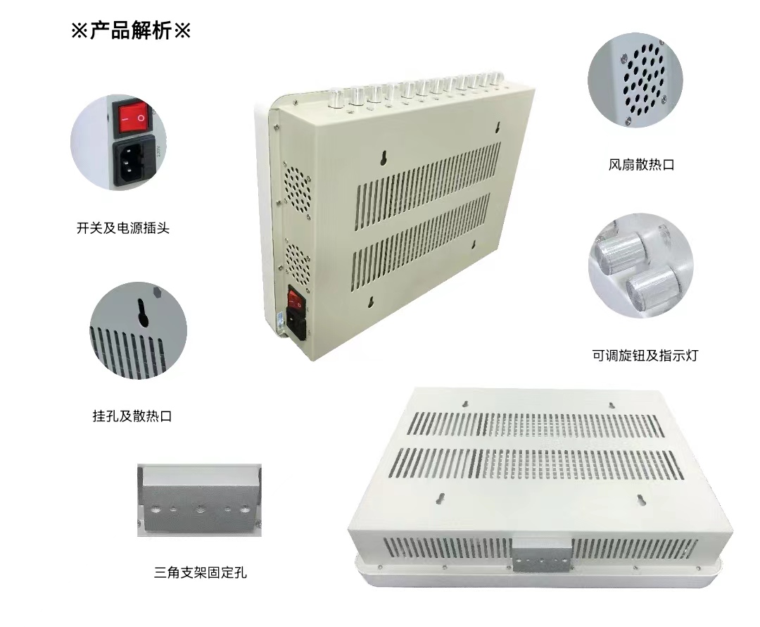 4. 内置高增益定向天线。每路配有可调节按钮,可自选开关。